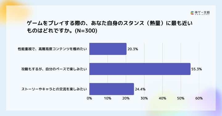 プレイスタイルは「攻略もするが、自分のペースで楽しみたい」が最も多く、ビジュアル面では顔立ちや表情の良さに惹かれる傾向があります。