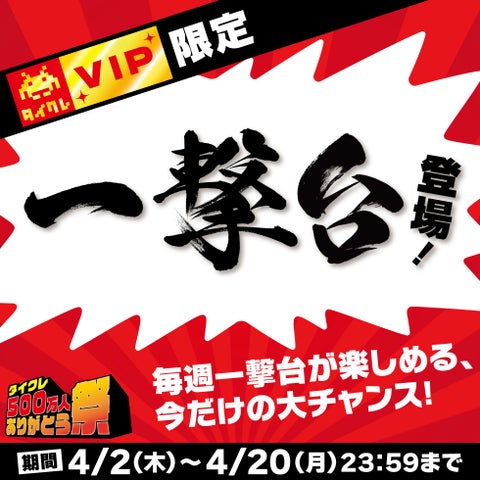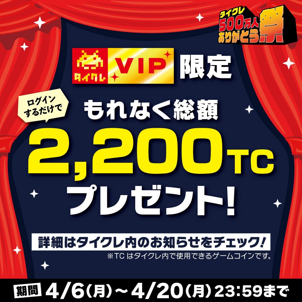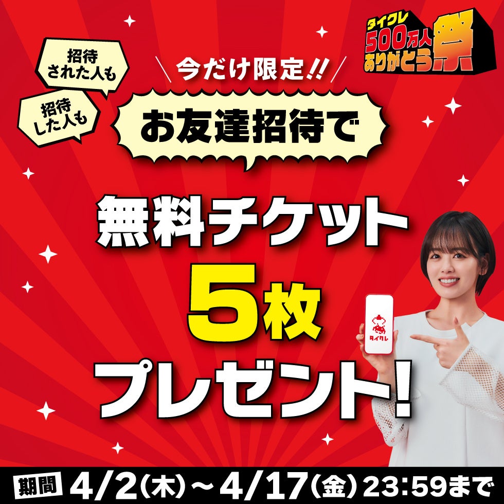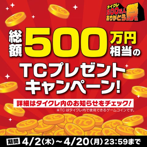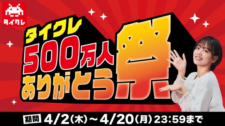 これを記念し、「タイクレ500万人ありがとう祭」を4月2日(木)より開催する。