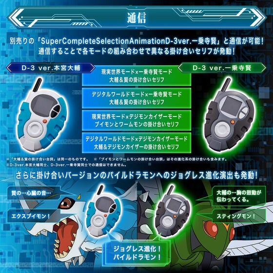 この商品は、アニメ『デジモンアドベンチャー02』のキャラクターが使用する「D-3」を再現したもので、2つのD-3を通信させることで異なる掛け合い台詞が発動します。