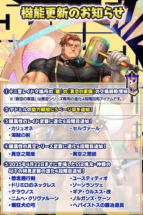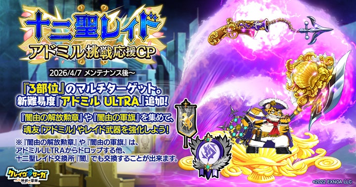 新難易度「アドミル ULTRA」が登場する「十二聖レイド アドミル挑戦応援キャンペーン」では、「闇由の解放勲章」や「闇由の軍旗」を集めて、魂友「アドミル」やレイド武器を強化できます。