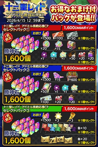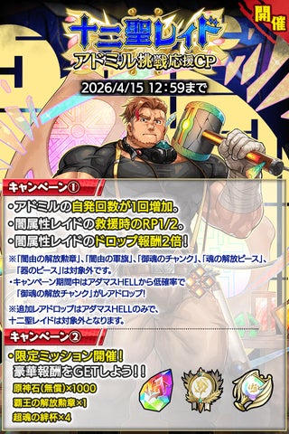 キャンペーン1では、アドミルの自発回数+1、闇属性レイド救援時のRP1/2、闇属性レイドのドロップ報酬2倍が実施されます。