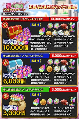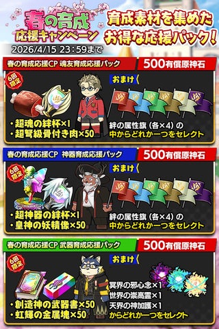 また、期間限定のお得なパック販売や、「春の育成応援キャンペーン」も同時開催され、クエストクリア時の経験値2倍や、ログインボーナス、育成応援ガチャなどが用意されています。