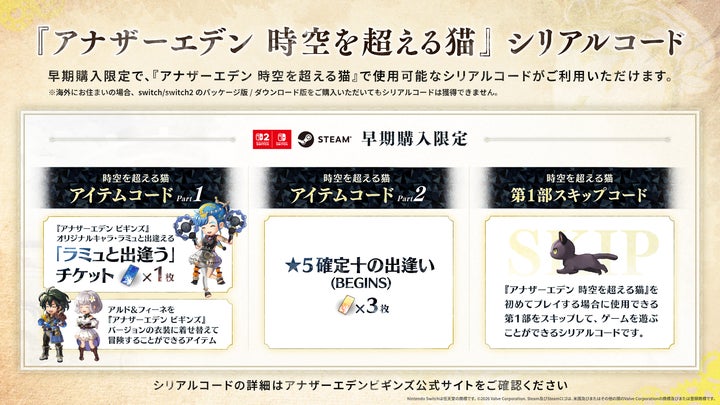 早期購入特典として、『アナザーエデン 時空を超える猫』で使用できるシリアルコードが付属する。