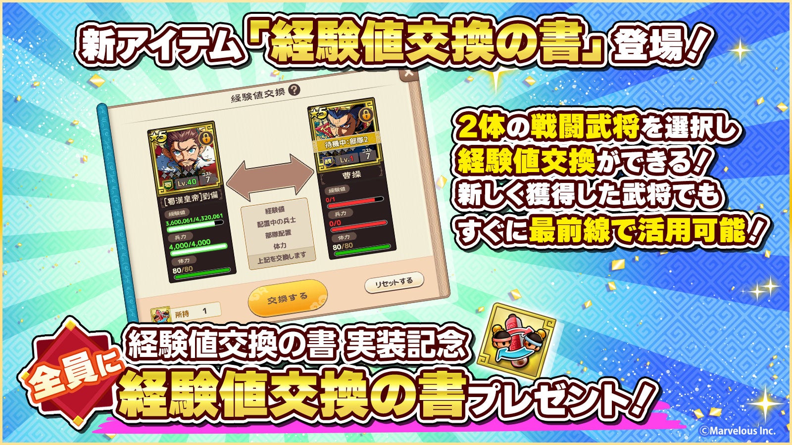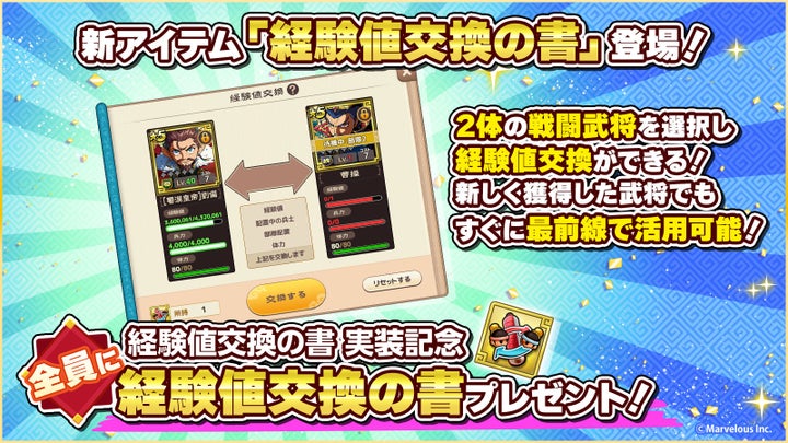 • 新アイテム「経験値交換の書」が登場、全プレイヤーにプレゼント、お得パックも販売。