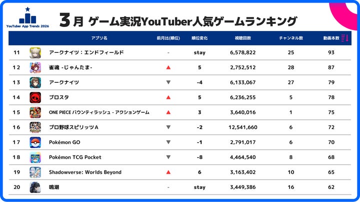 - 2026年3月のゲーム実況YouTuberが取り上げたスマホゲームランキングを発表