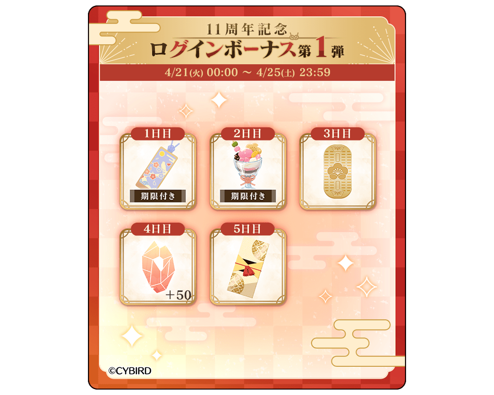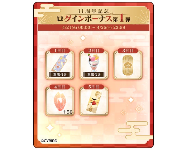 - 11周年記念ログインボーナスを3本立てで開催。