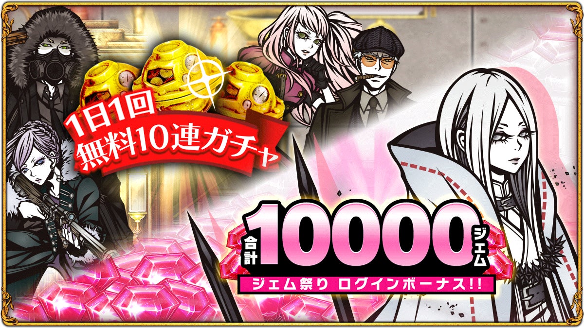- 無料の10連ガチャやジェム祭りログインボーナスもあり