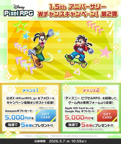また、1.5周年を記念したキャンペーンも実施されており、ログインボーナスやガチャチケットの配布、ギフトカードが当たる抽選も行われる。