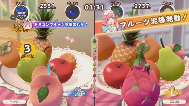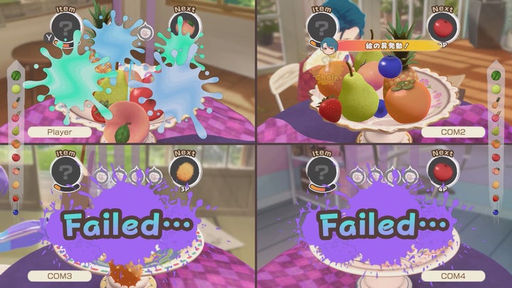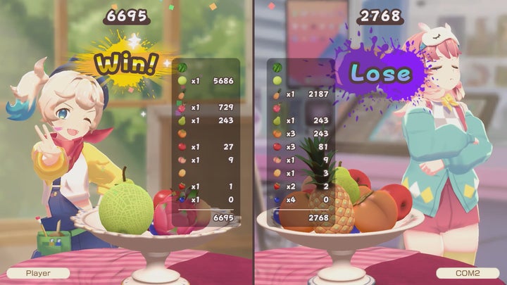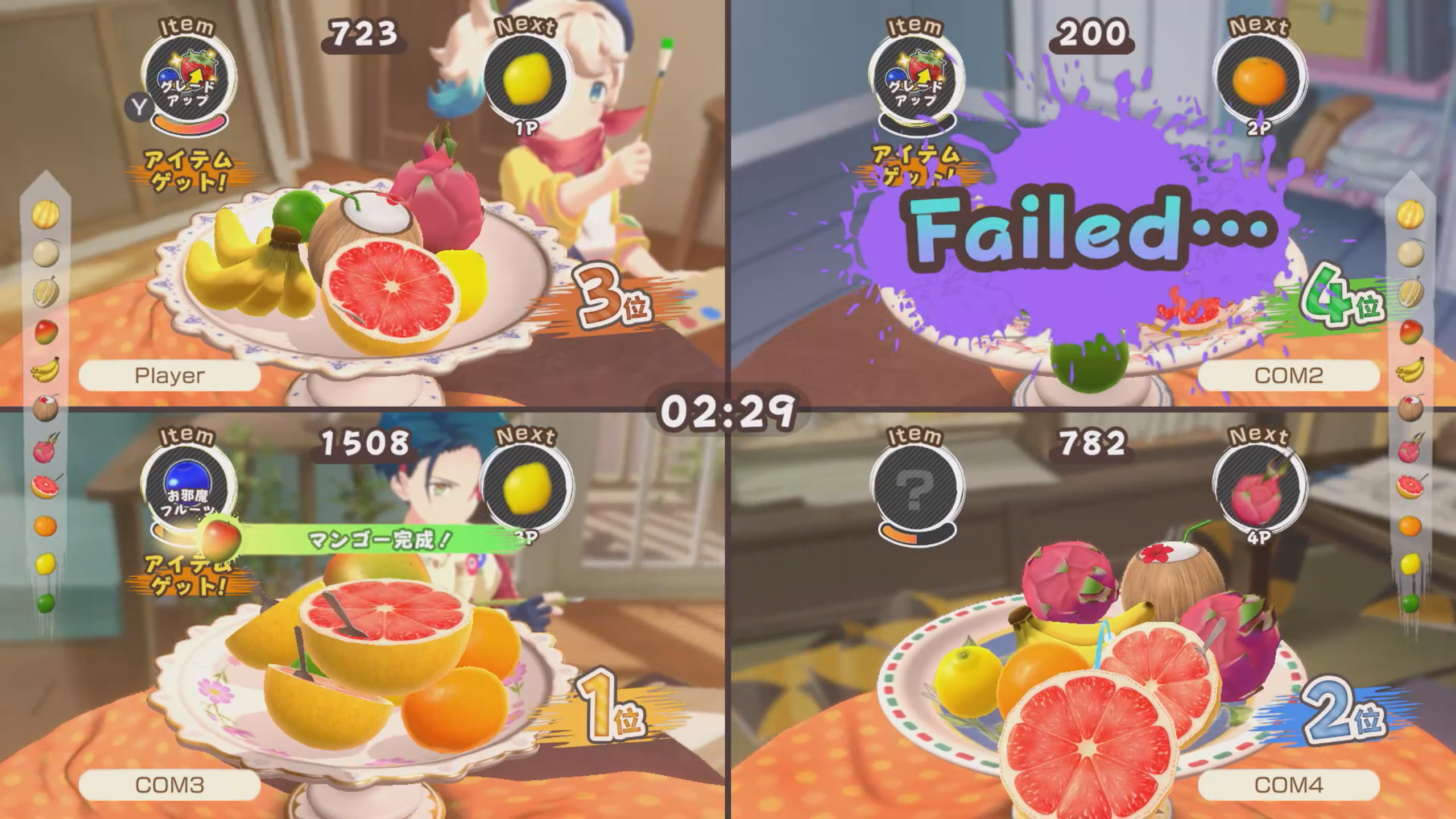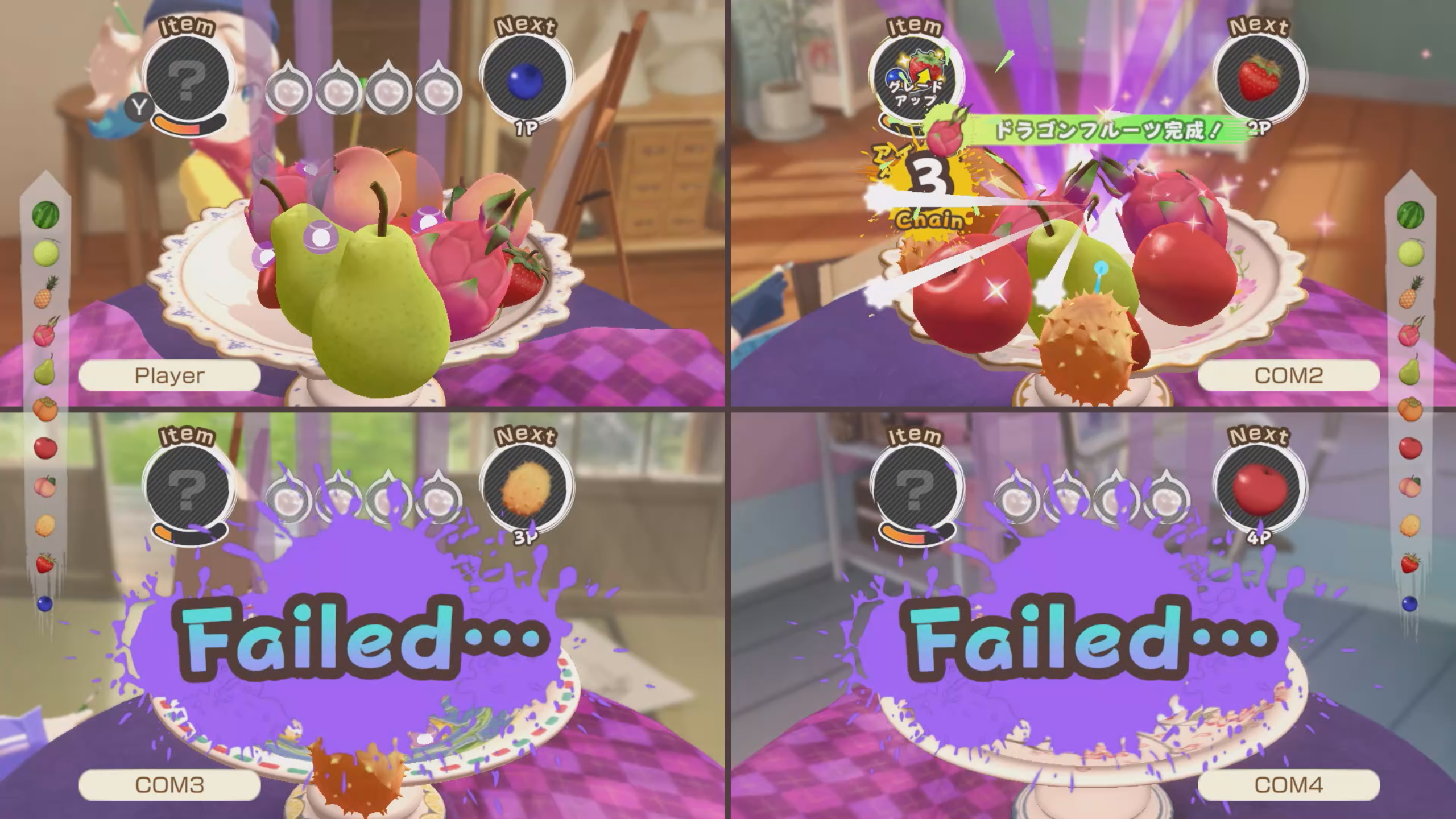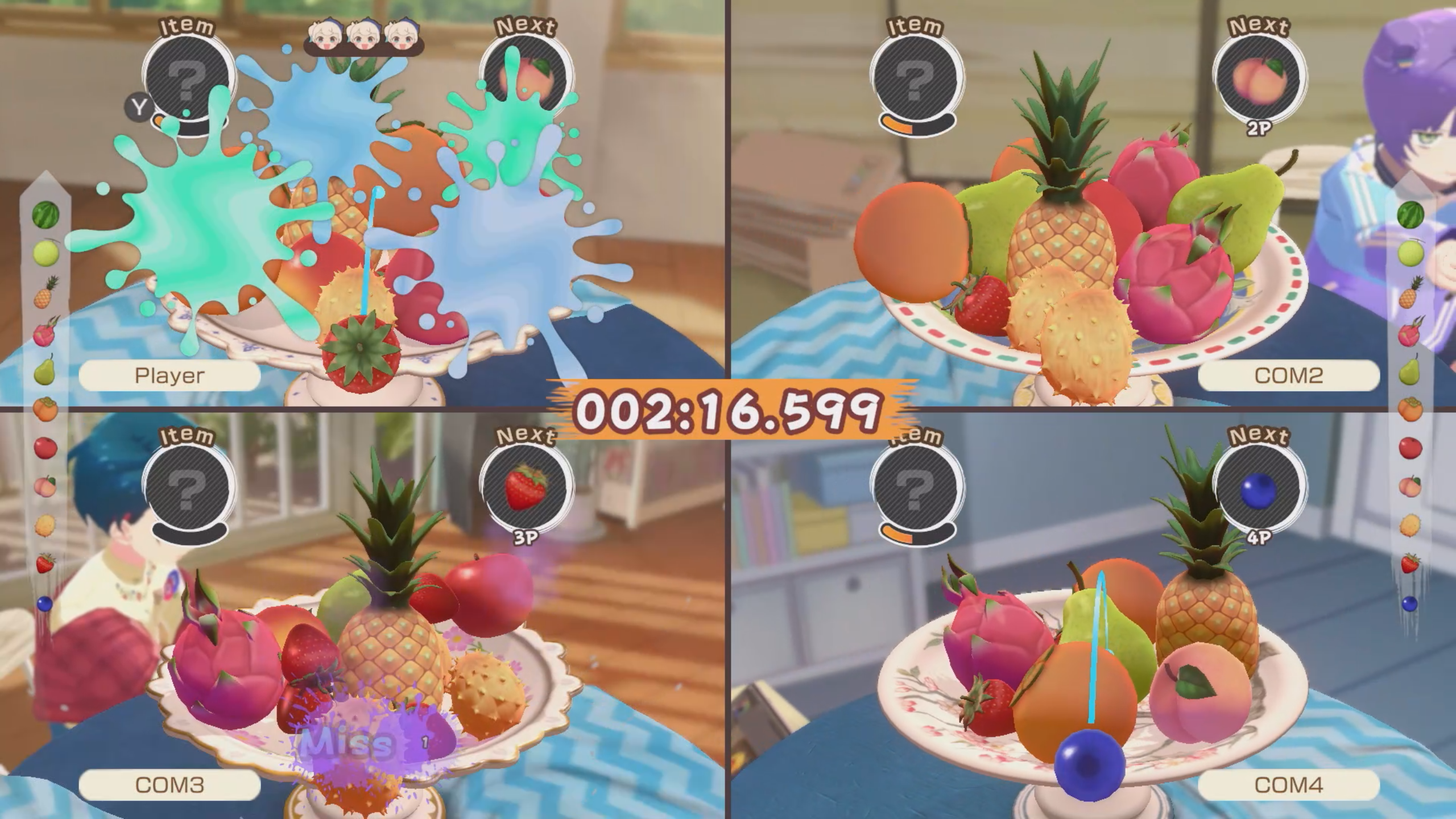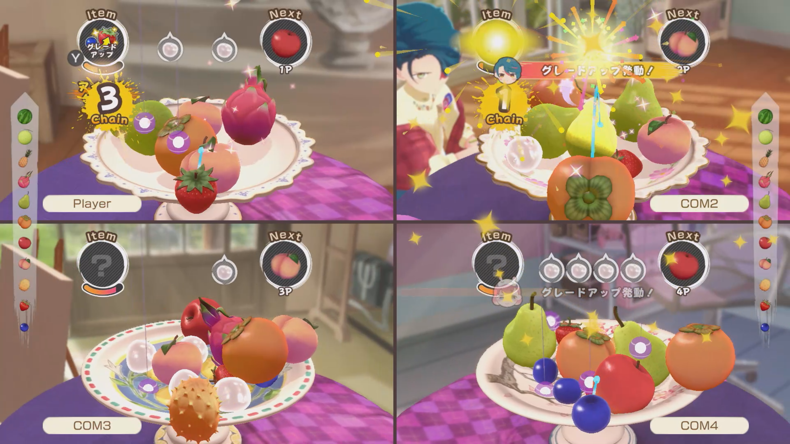 ゲームは、フルーツを積み上げて対戦するパーティーゲームで、オンライン、ローカル対戦、シングルプレイにも対応。
