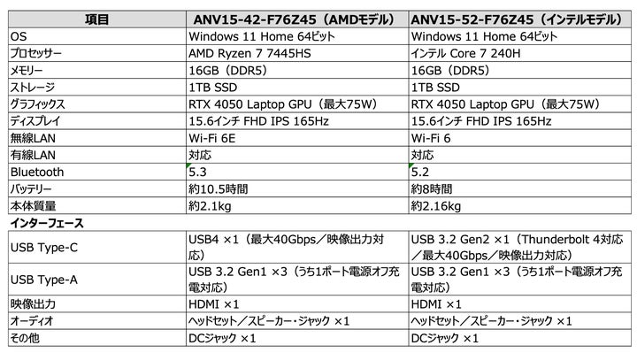 - AMD Ryzen 7 7445HS / インテル Core 7 240H