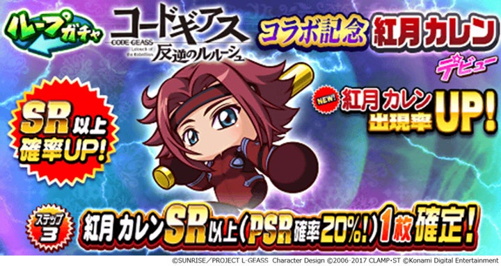 コラボ記念のループガチャでは、「ルルーシュ・ランペルージ」「枢木 スザク」「紅月 カレン」が登場します。