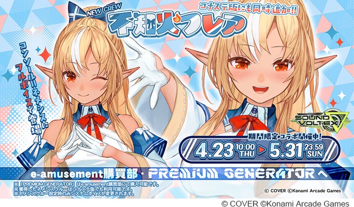 コナミの音楽ゲーム『DanceDanceRevolution WORLD』、『pop’n music High☆Cheers!!』、『SOUND VOLTEX ∇』の3タイトルと、VTuberグループ「ホロライブ」所属の「不知火フレア」とのコラボが実現した。