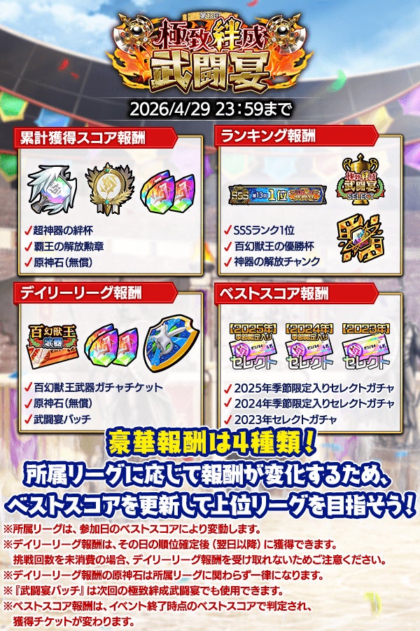 物理属性が有利な水属性大型ボス「グレイシオン」に挑む「極致絆成武闘宴」が開催され、累計獲得スコア報酬、デイリーリーグ報酬、ランキング報酬、ベストスコア報酬が用意されている。