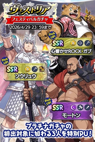 さらに、期間限定ガチャとして『ヴェストリアフェスティバル』ガチャ、復刻『ヴァルテオスシリーズ』ガチャ、土属性SSR確定ガチャも開催。