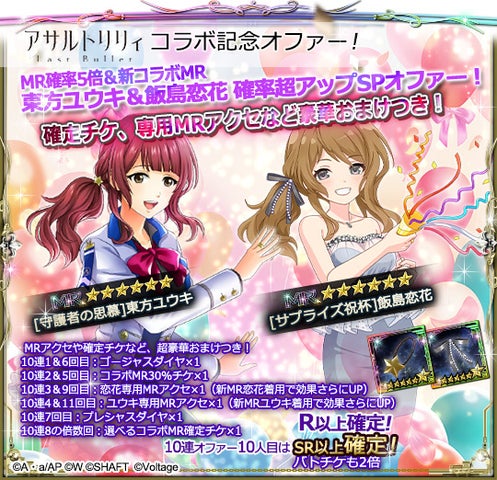 コラボガチャでは、「アサルトリリィ Last Bullet」の「飯島恋花」と「六本木サディスティックナイト」の「東方ユウキ」の描きおろし限定カードが登場し、人気声優・石飛恵里花の録りおろしボイスも収録。