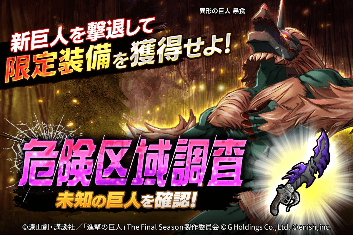 - 新戦術スタイル、危険区域調査の新エリア、期間限定のイベント、ログインボーナス、グッズキャンペーン、進撃の巨人、調査兵団、巨人、フルボイス