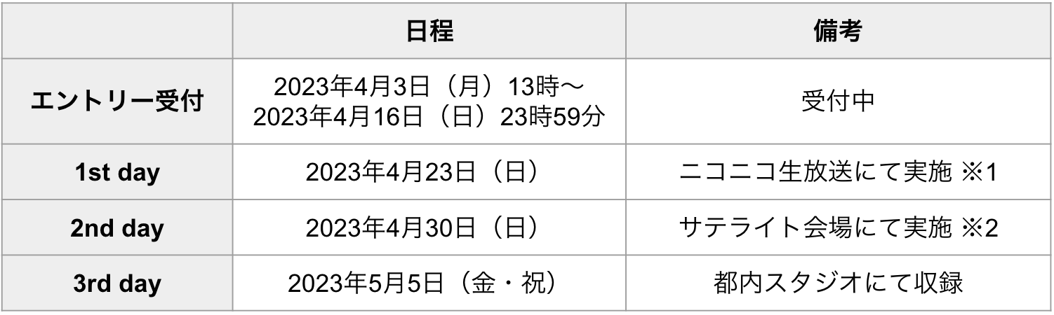 受付期間は4月16日(日)23時59分までで、大会は1st day、2nd day、3rd dayの3日間にわたって開催されます。