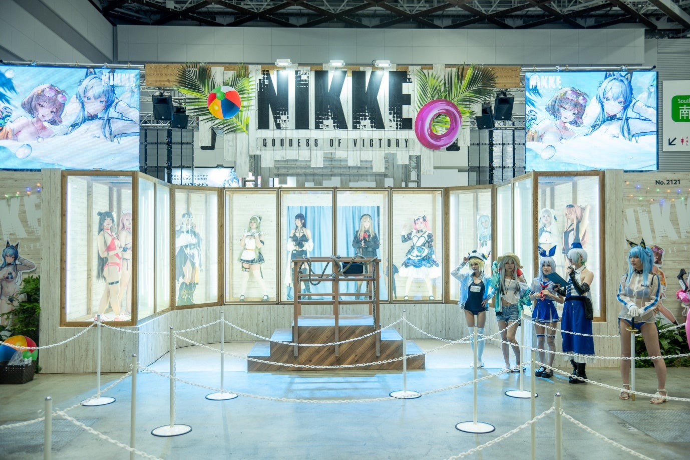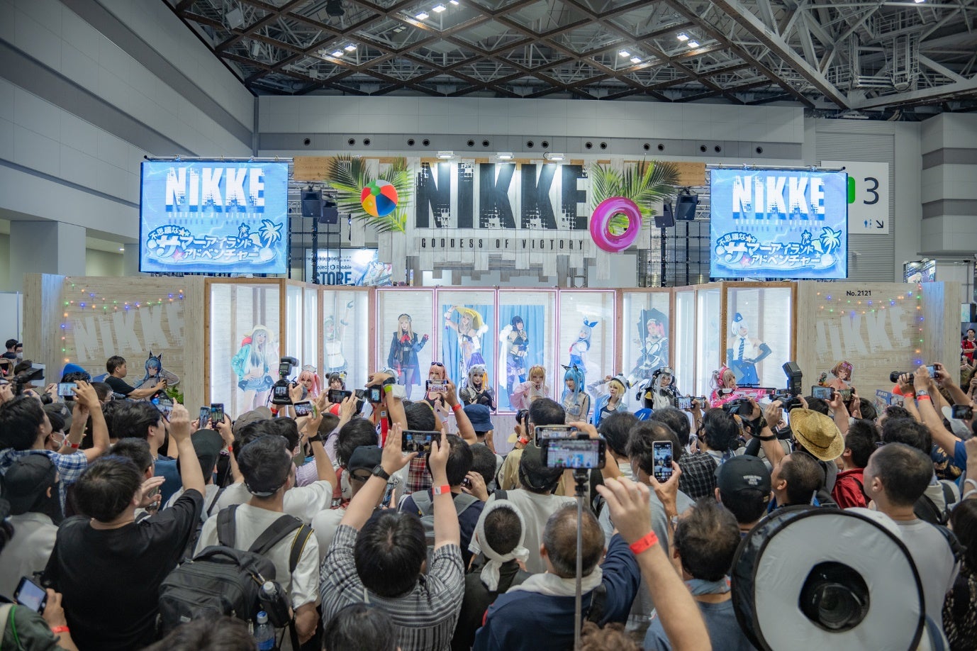 ブースでは、来場者限定のイベントや「リアル10連ガチャ」が行われ、人気コスプレイヤーたちが限定水着コスチュームで登場しました。