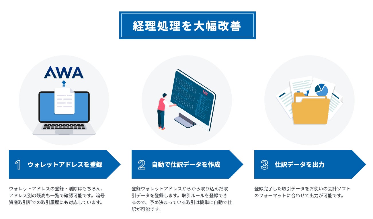 AWAはデジタルアセット取引の原価や損益計算だけでなく、暗号資産を扱う事業者特有の経理業務もサポートし、ブロックチェーンの仕組みが分からない人でも利用できます。