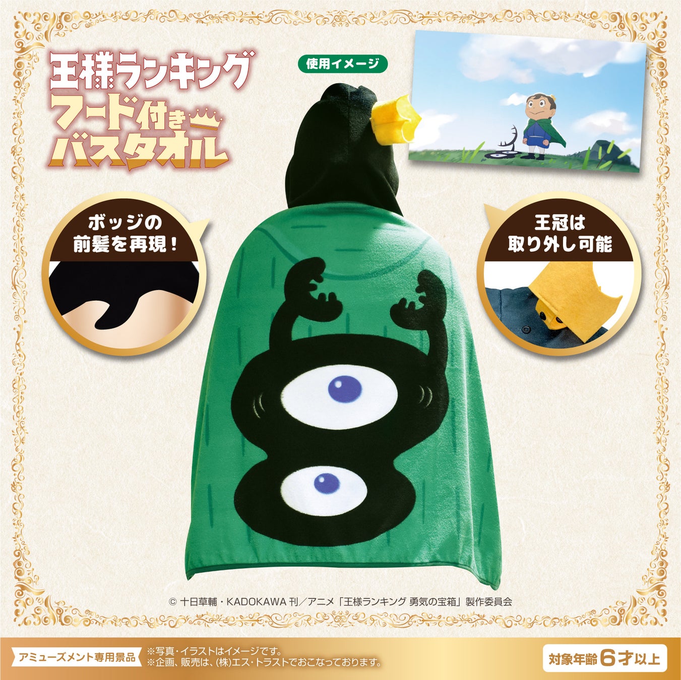 株式会社エス・トラストは、2023年8月5週から全国のゲームセンター・オンラインクレーンゲームで、テレビアニメ「王様ランキング」のアミューズメント景品第三弾として、「フード付きバスタオル」を順次投入する予定です。