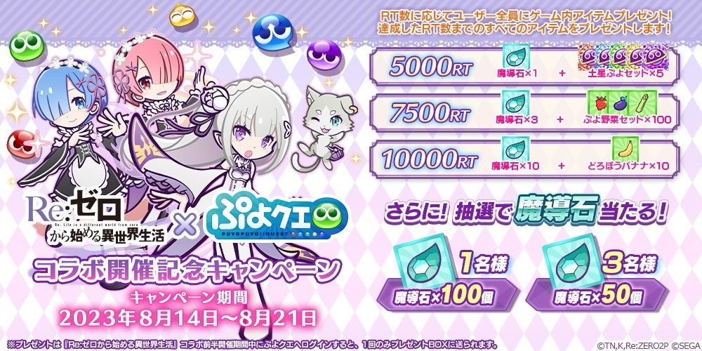 セガは、人気のパズルRPG『ぷよぷよ!!クエスト』にて、2023年8月23日から『Re:ゼロから始める異世界生活』とのコラボイベントを開催します。