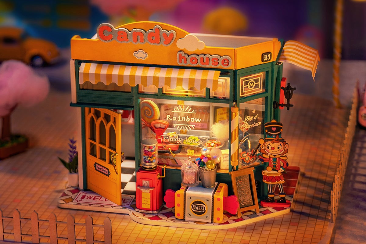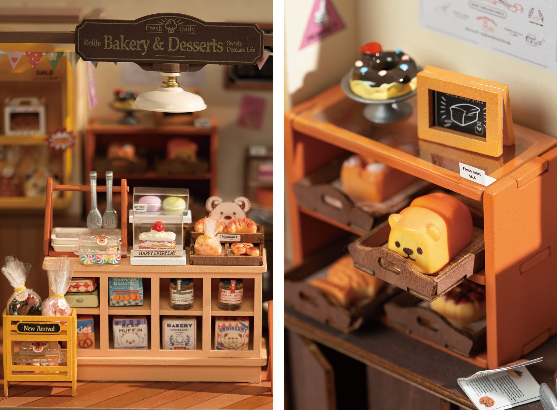 どちらのミニチュアハウスも高品質で、LED付きのライトが小さなお店を照らします。