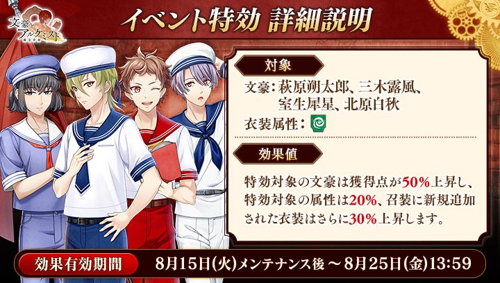 - 限定召装では「室生犀星」「萩原朔太郎」「北原白秋」の新衣装が入手可能
