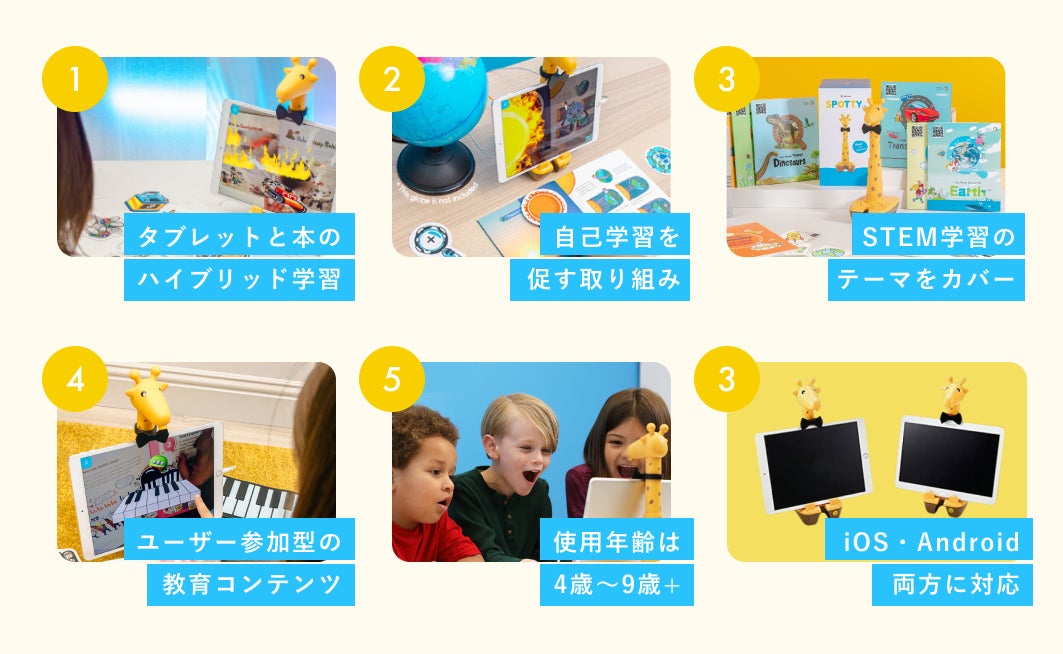 タブレットと本のハイブリッド学習や自己学習を促す取り組み、STEM学習のテーマをカバーするなどの特徴があります。