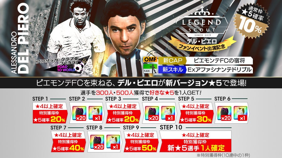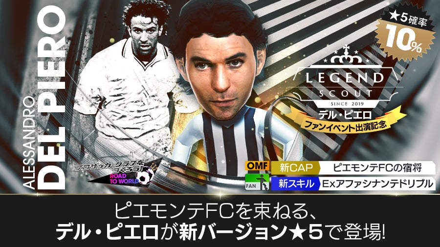 「サカつくRTW」では、イタリアクラブのスーパースター「アレッサンドロ・デル・ピエロ」などが新たな★5選手として参加する「デル・ピエロ サカつくファンイベント出演記念 LEGEND SCOUT」が現在開催中です。