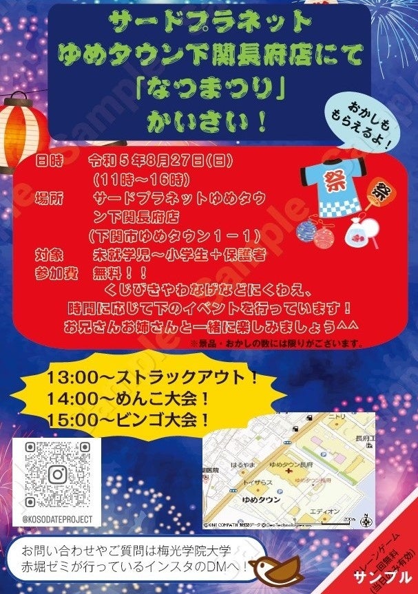 その一環として、梅光学院大学の学生と共に、ザ・サードプラネット山口店とザ・サードプラネットゆめタウン下関長府店で「なつまつり」イベントを開催します。