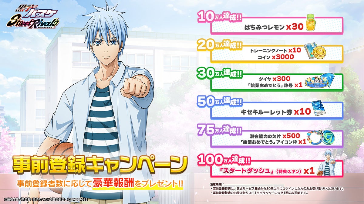 黒子のバスケ Street Rivals、事前登録、公式サイト、AppStore、GooglePlay、Twitter、LINE、事前登録キャンペーン、無料、アプリ内課金