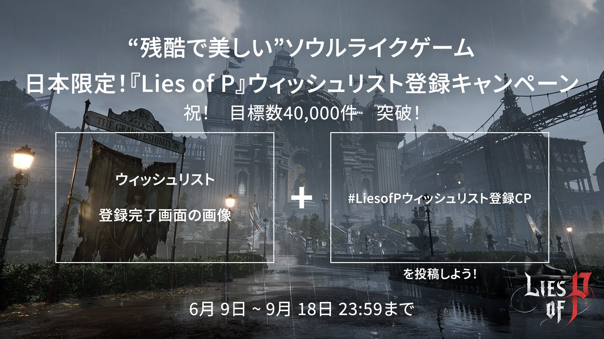 NEOWIZは、『Lies of P』の日本国内限定のSteamウィッシュリスト登録キャンペーンで、登録件数が40,000件を突破したことを発表しました。