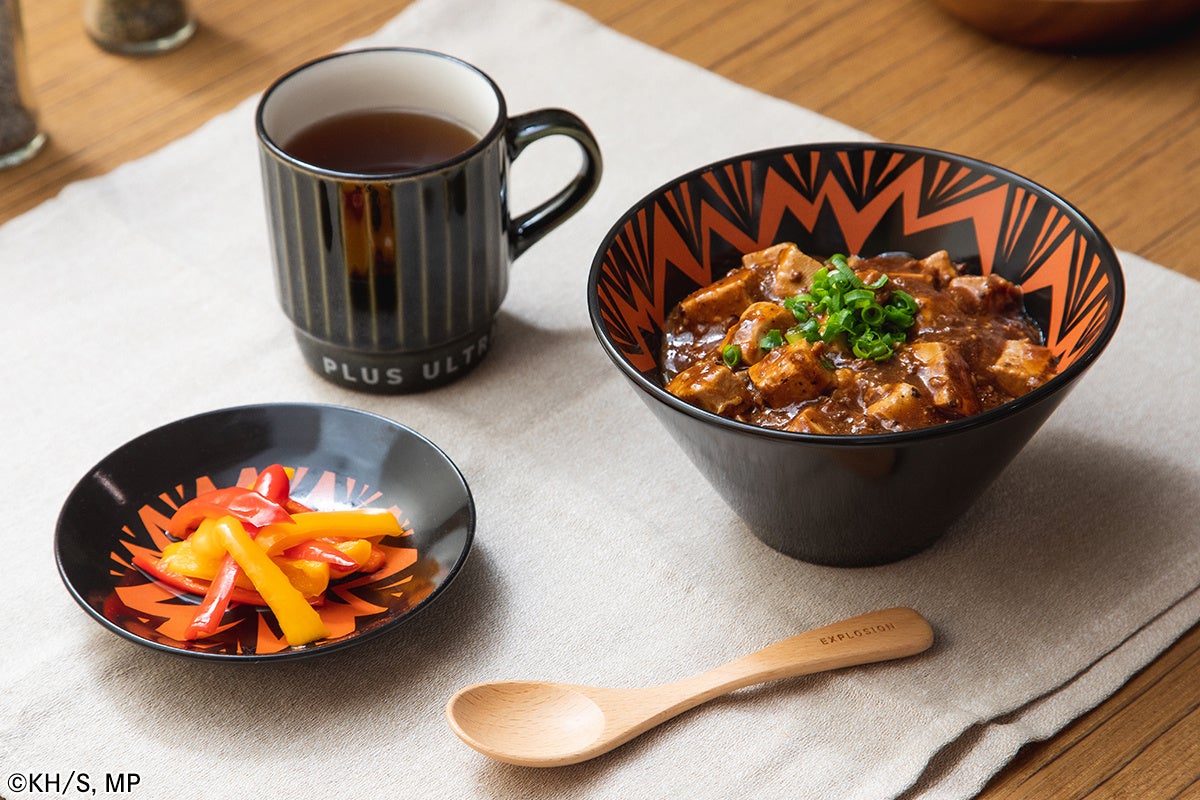 刺激的な模様がフチを彩るどんぶりは、辛いものが食べたくなるデザイン。底面には、コスチュームの装飾と“爆破”を英訳した「EXPLOSION」の文字をプリントしました。四川麻婆は勿論、ヌードル鉢としても使えるアイテムです。セットの小皿は、副菜やデザート用にも使用できます。