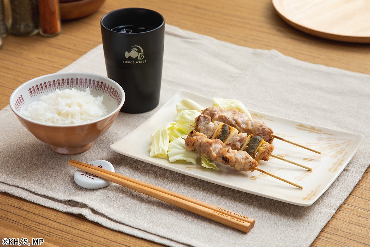 木製の箸には「FIERCE WINGS」の文字を刻印。箸置きにも“剛翼”をイメージした羽をプリント。