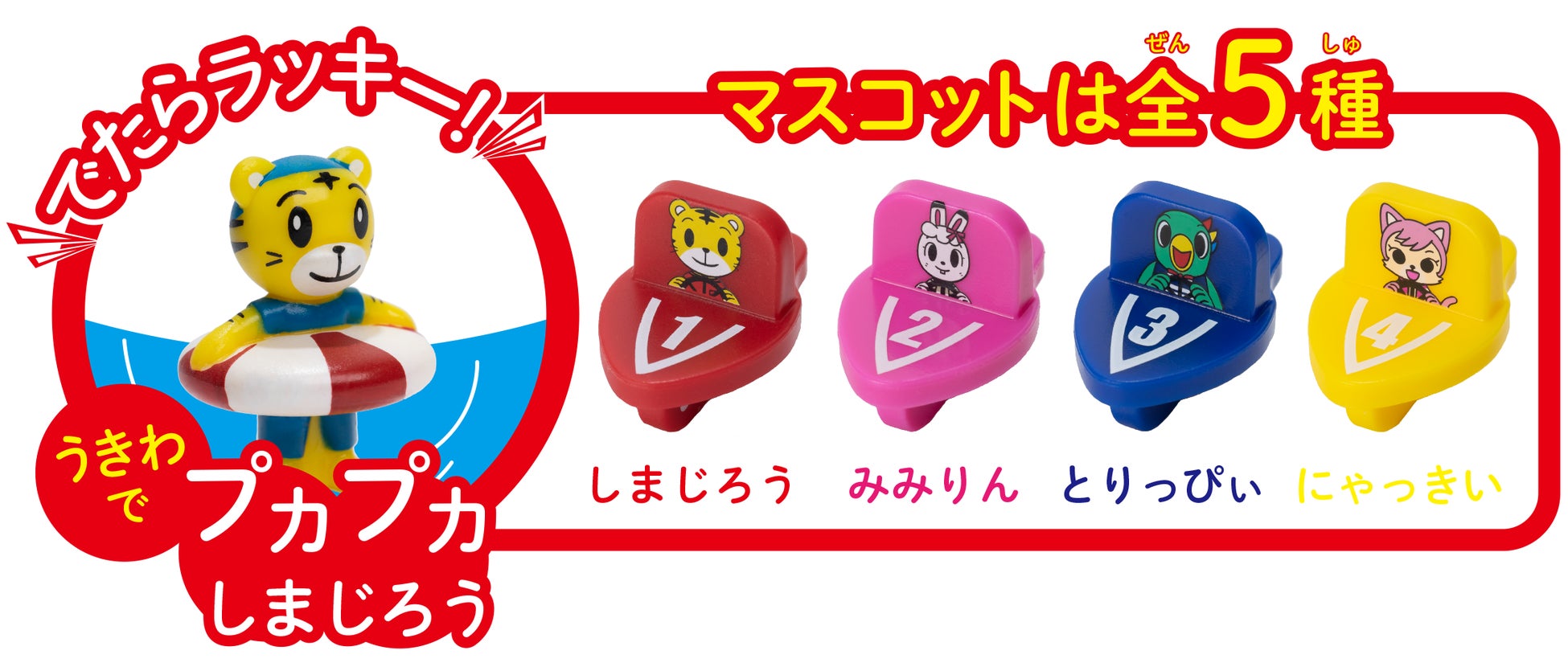 バスボールの中には「こどもちゃれんじ」のキャラクターがボートに乗った玩具が入っており、知育要素や競争遊びも楽しめます。