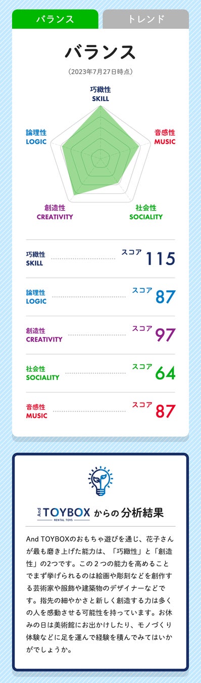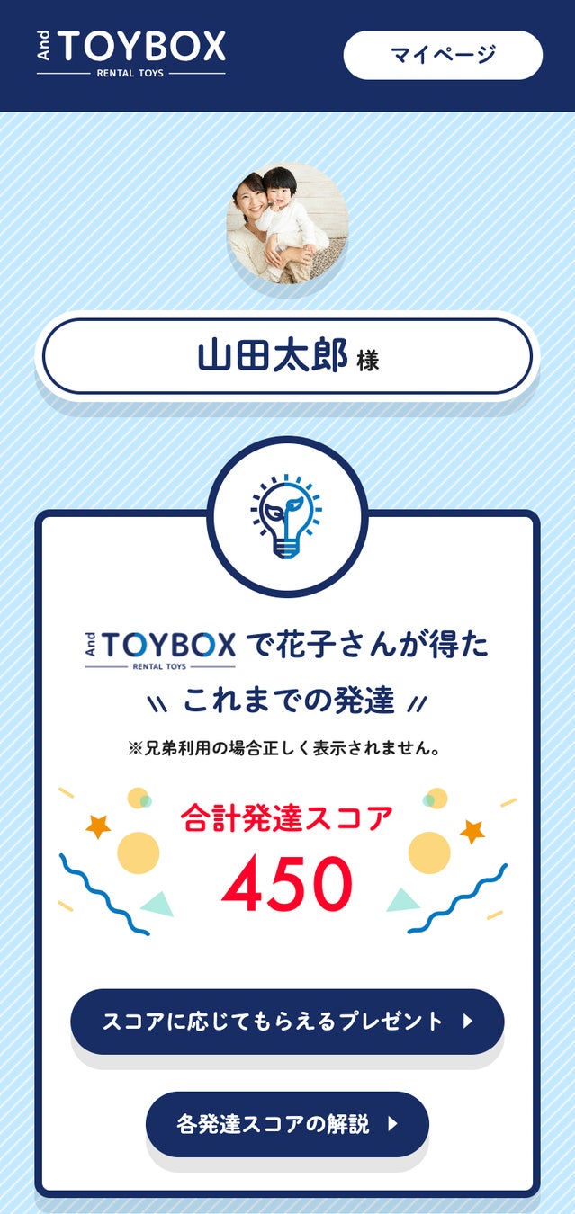この機能では、おもちゃごとに巧緻性、論理性、創造性、社会性、音感性の5つの項目が設定され、お子様の成長をマイページで確認できます。