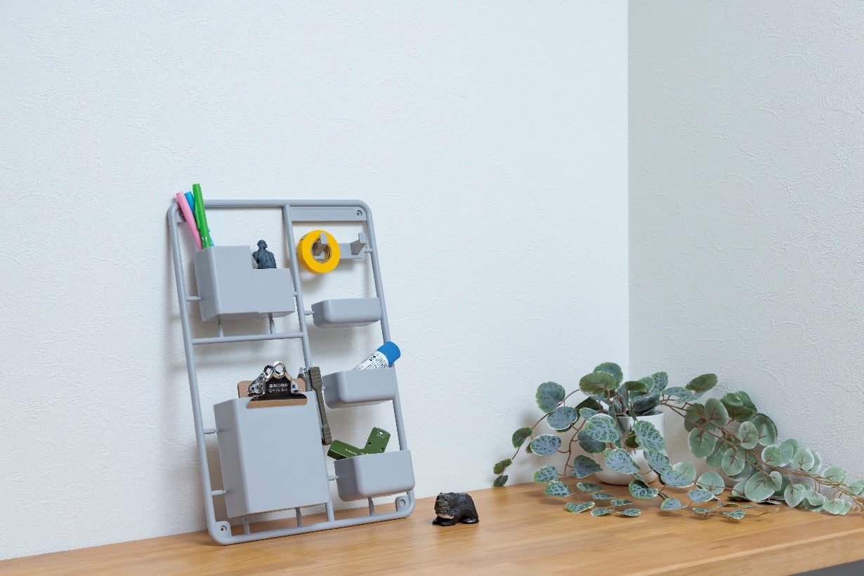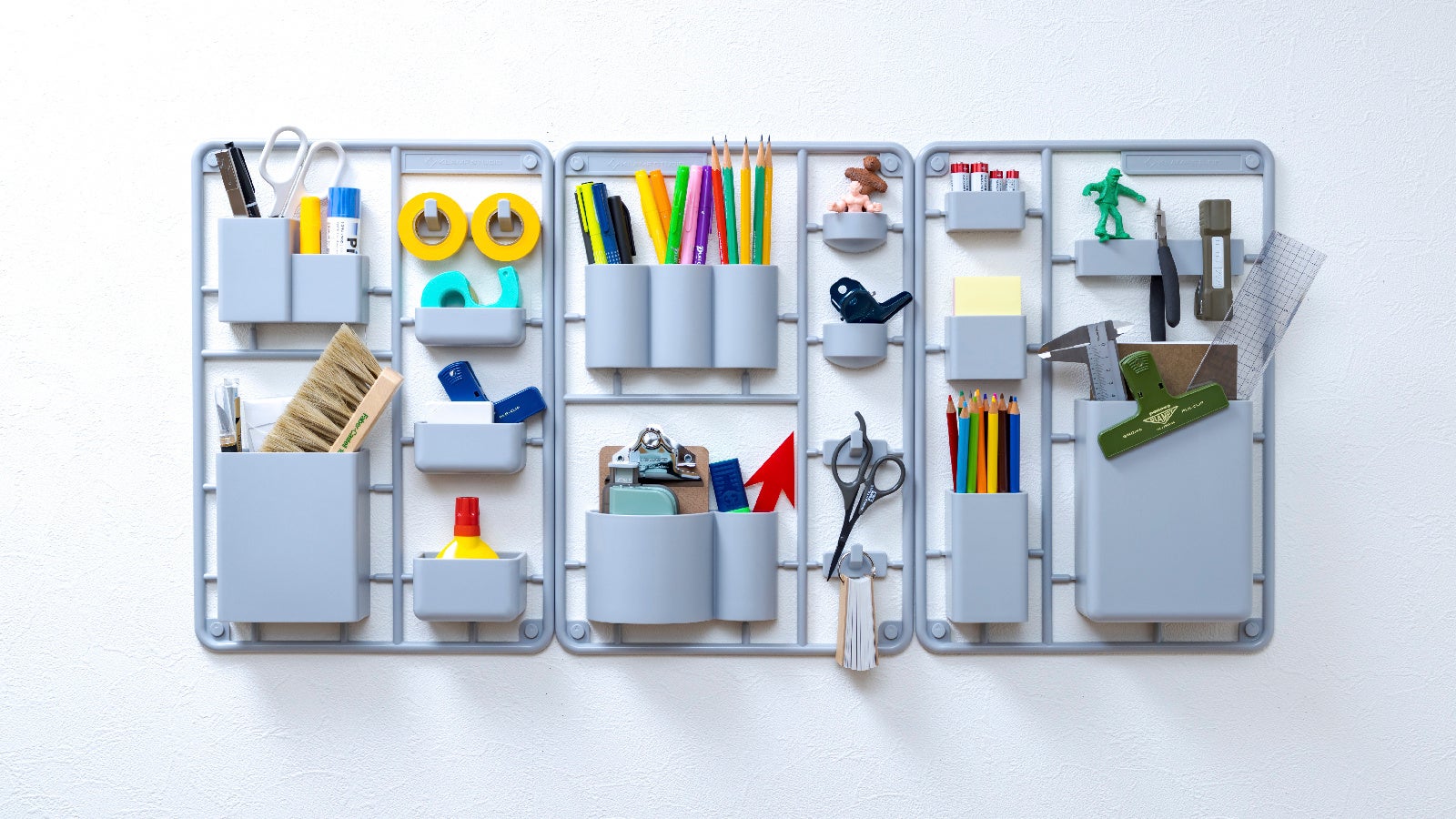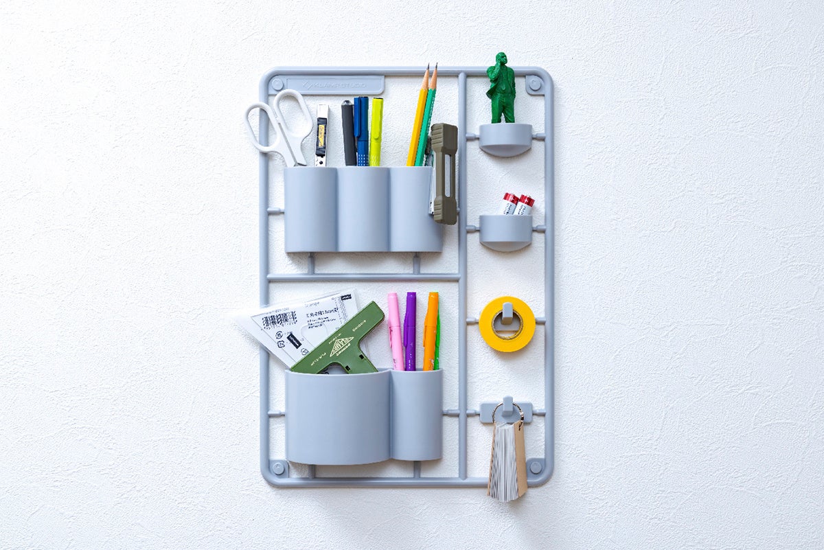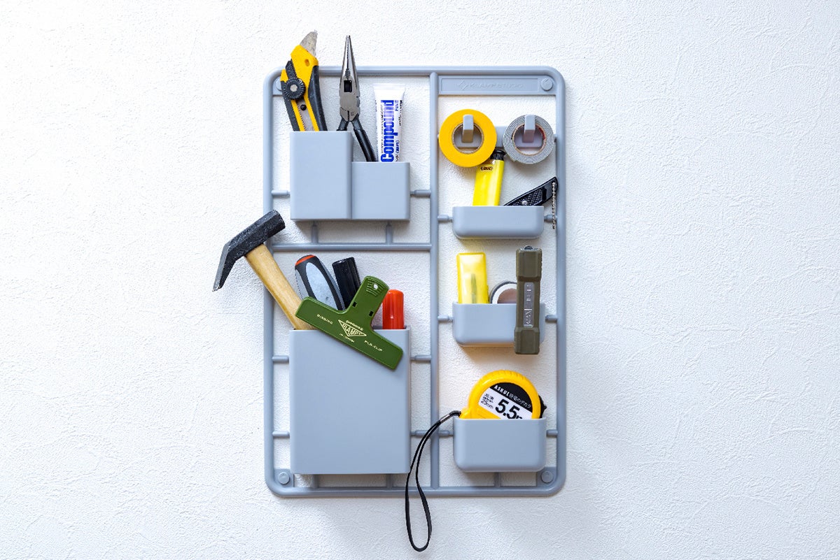 この収納は、プラモデル好きなスタッフが仕事場で散らかりやすい道具を整理するために企画されたもので、美しいデザインと面白さにこだわっています。