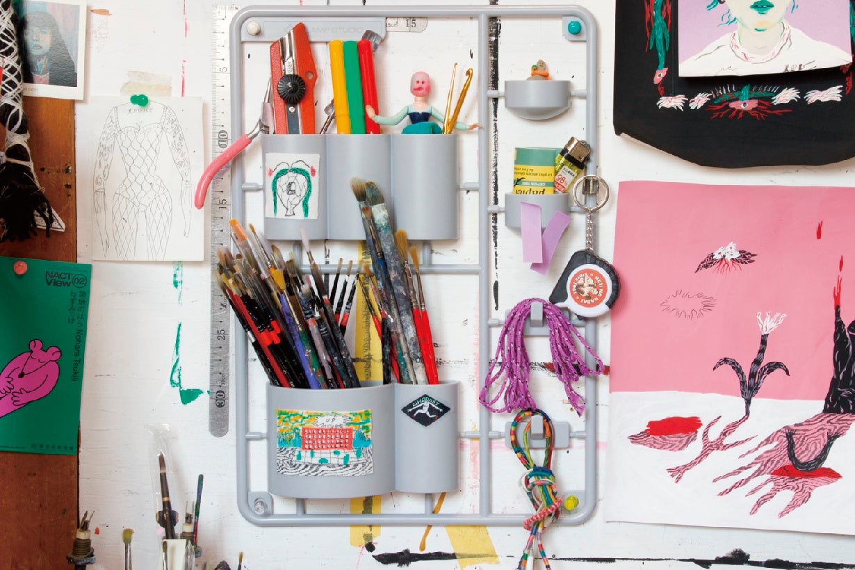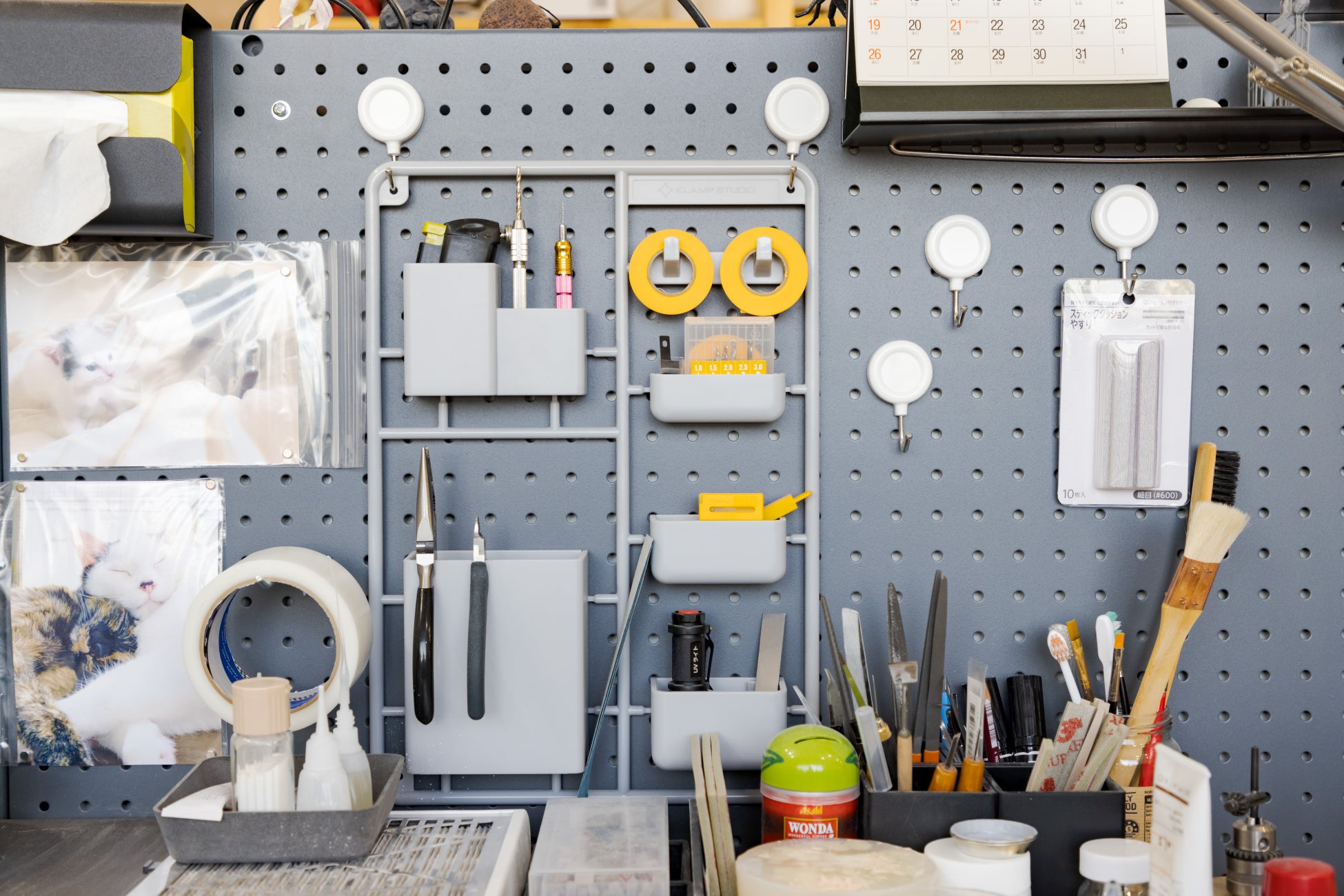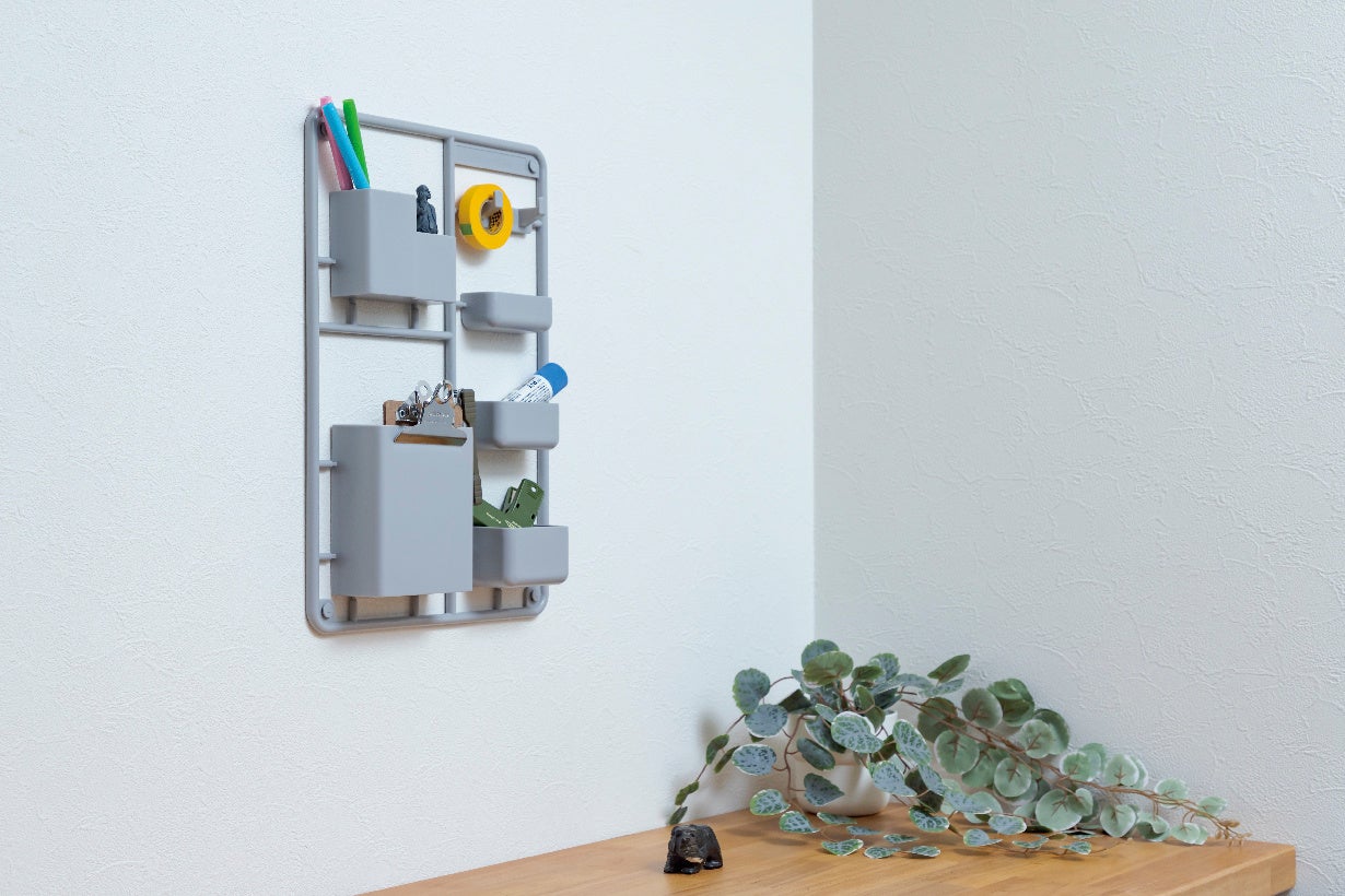 この収納は、プラモデル好きなスタッフが仕事場で散らかりやすい道具を整理するために企画されたもので、美しいデザインと面白さにこだわっています。