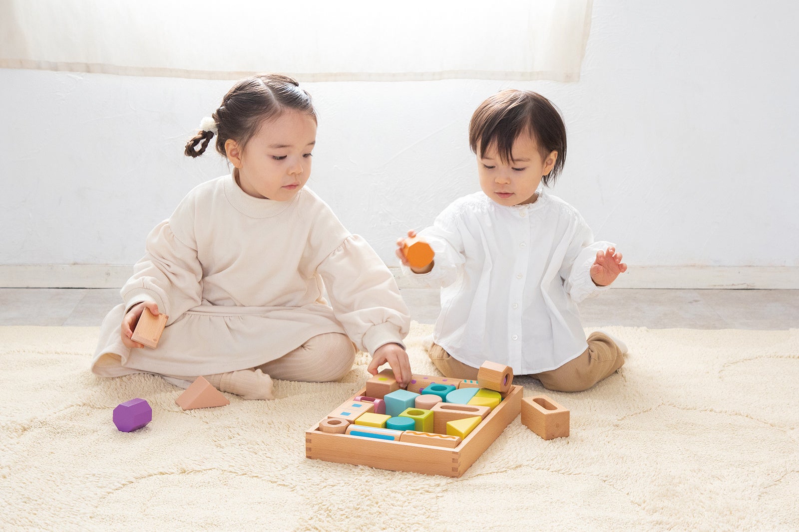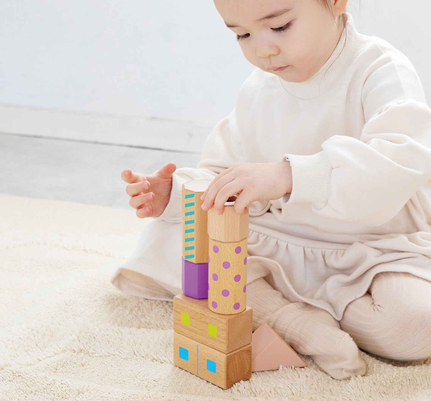 このつみきセットは、全てのつみきが音を奏でる特徴があり、振ったり積んだりすることで様々な音の遊びが楽しめます。