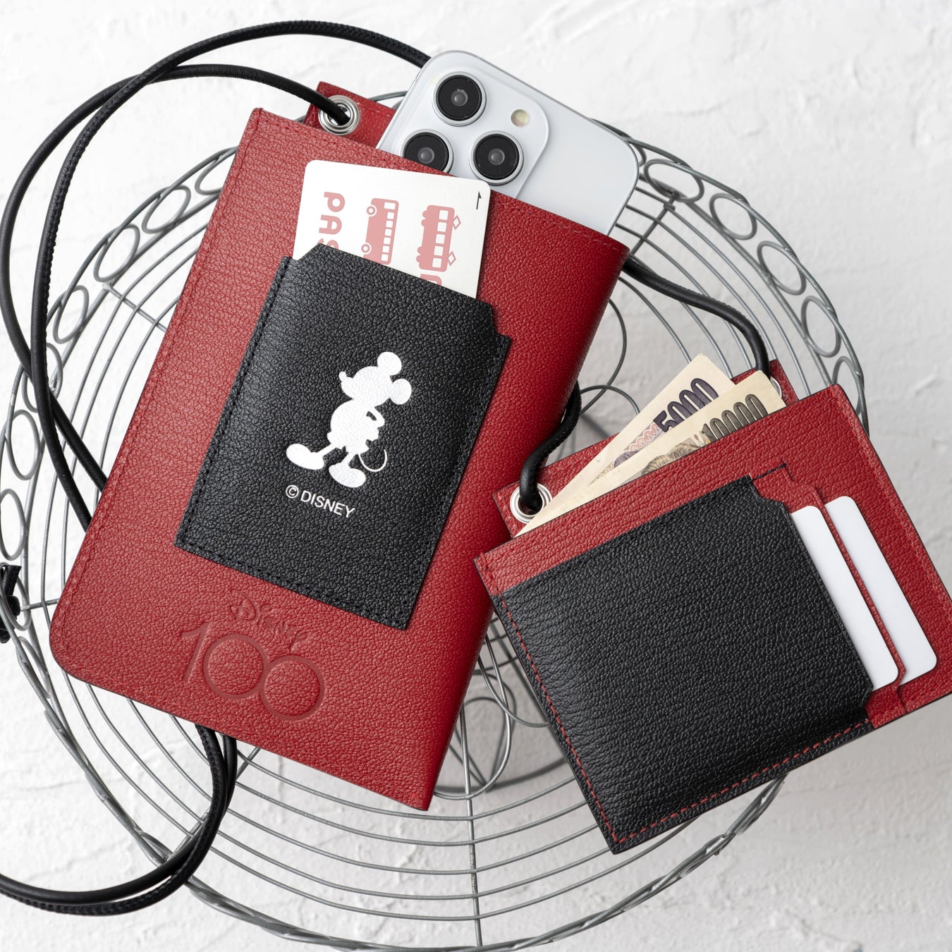 このウォレットは、ミッキーマウスをイメージした4つのカラーバリエーションがあり、小銭や紙幣、カードを収納することができる小さなウォレットと、スマートフォン2台と小物を収納できるポーチが付いています。
