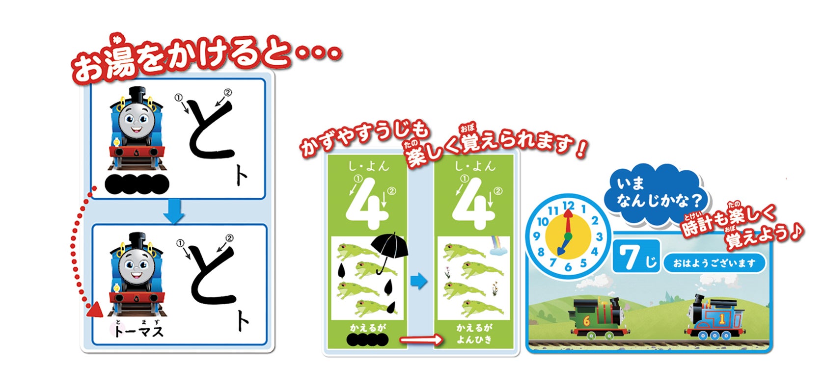 『きかんしゃトーマス おふろでもじかずとけい』では、新キャラクター「カナ」も登場し、ひらがなやカタカナで名前を覚えるだけでなく、数字の数え方や時計の読み方も学べます。