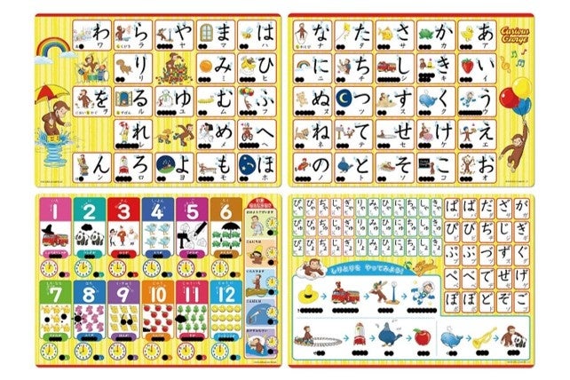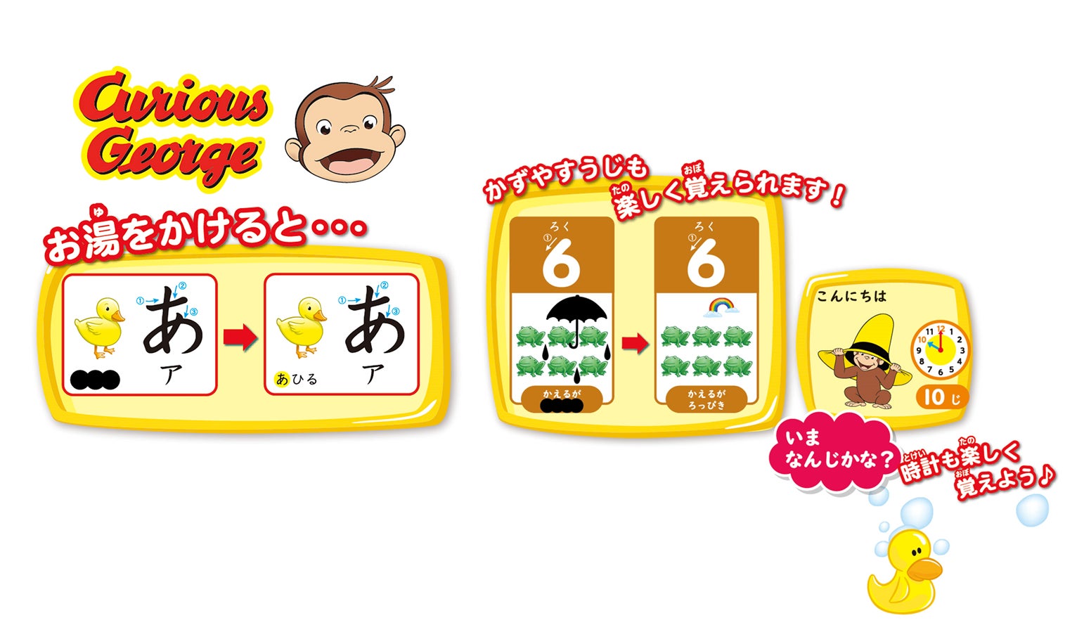 『おさるのジョージ おふろでもじかずとけい』では、ジョージの魅力が詰まったおふろシートで、イラストの名前を当てたり、数を数えたり、時間を当てることができます。