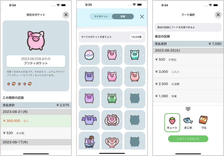この機能は、株式会社ポラリスエックスの協力を得て開発され、家計簿をつけながらキャラクターを育てることができます。