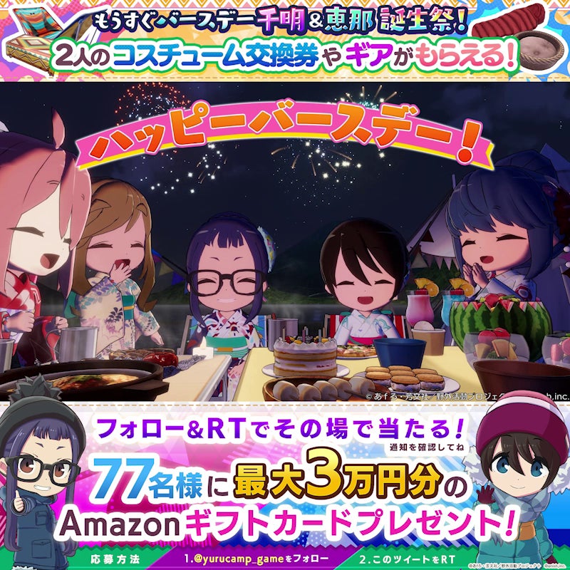 バースデー千明誕生祭と恵那誕生祭も同時に開催され、感謝の気持ちを込めて最大30000円分のAmazonギフトカードが当たるRTキャンペーンも実施されます。