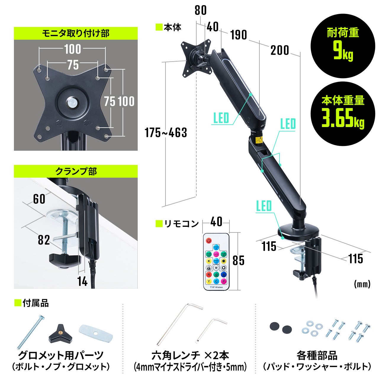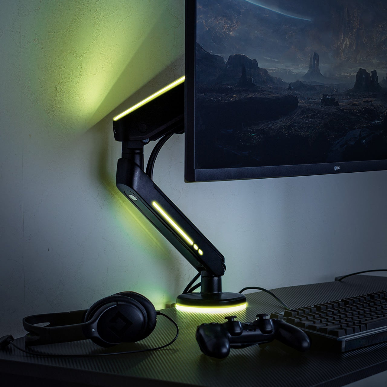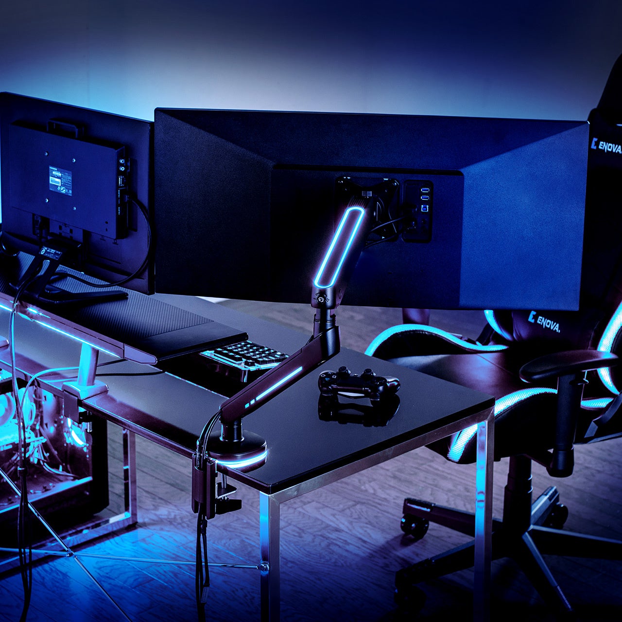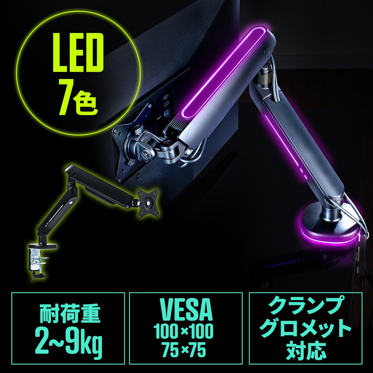 本製品は、アーム部が7色に光るゲーミング用に最適なモニターアームです。