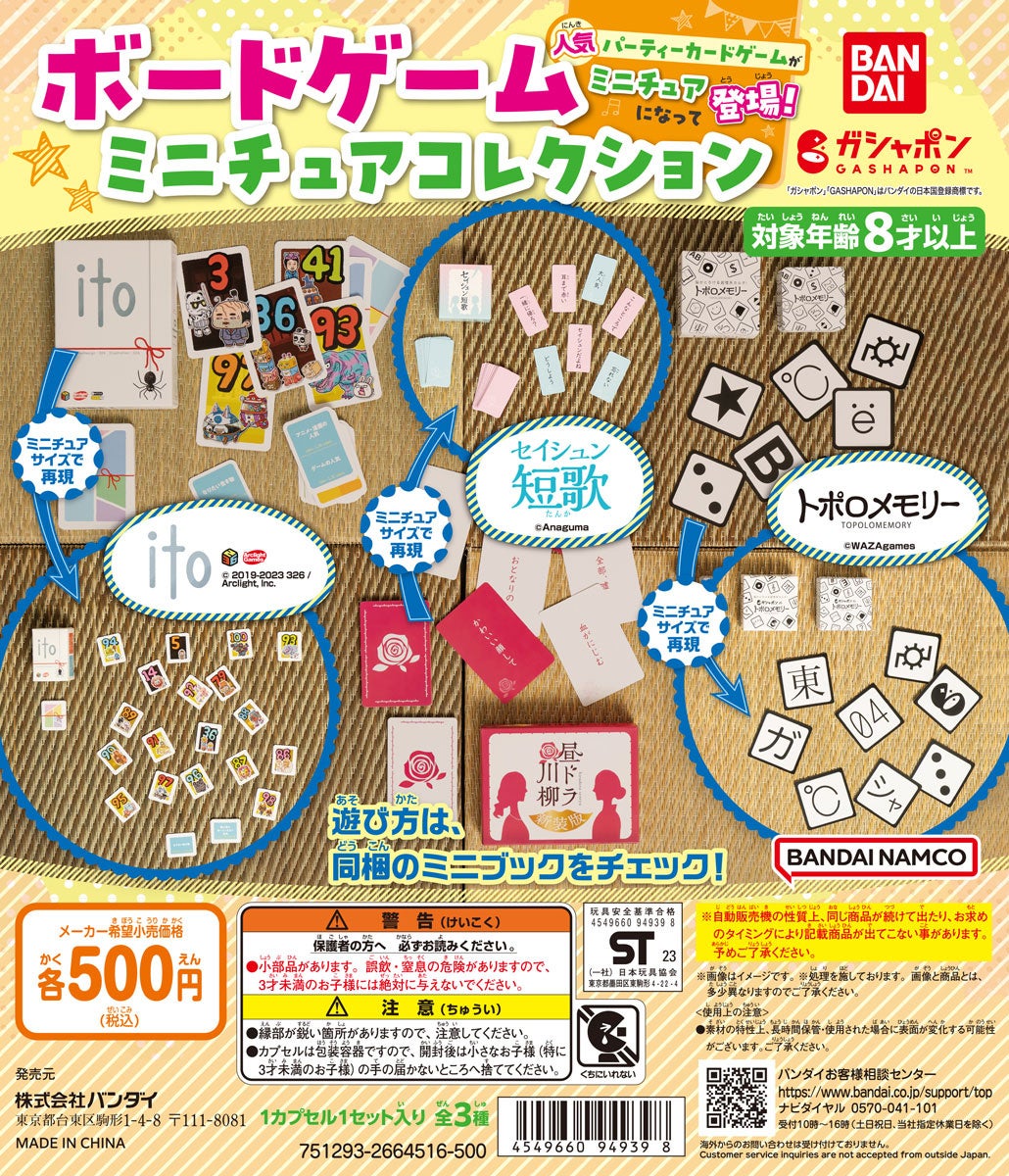 株式会社バンダイ ベンダー事業部は、人気のボードゲーム「ito」「トポロメモリー」「セイシュン短歌」をミニチュアサイズにした「ボードゲームミニチュアコレクション」を2023年8月第5週から順次、全国のガシャポンバンダイオフィシャルショップや玩具売場などで発売します。