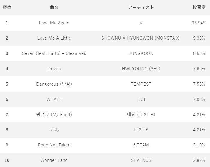 さらに、Vの「Love Me Again」が8月25日の放送回で1位を獲得しました。