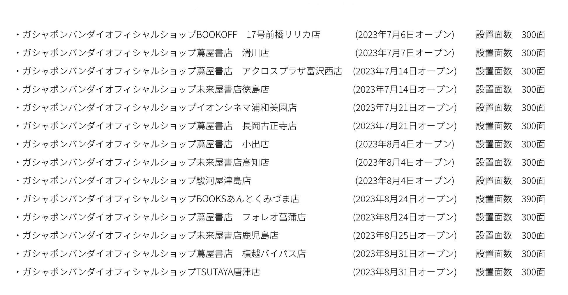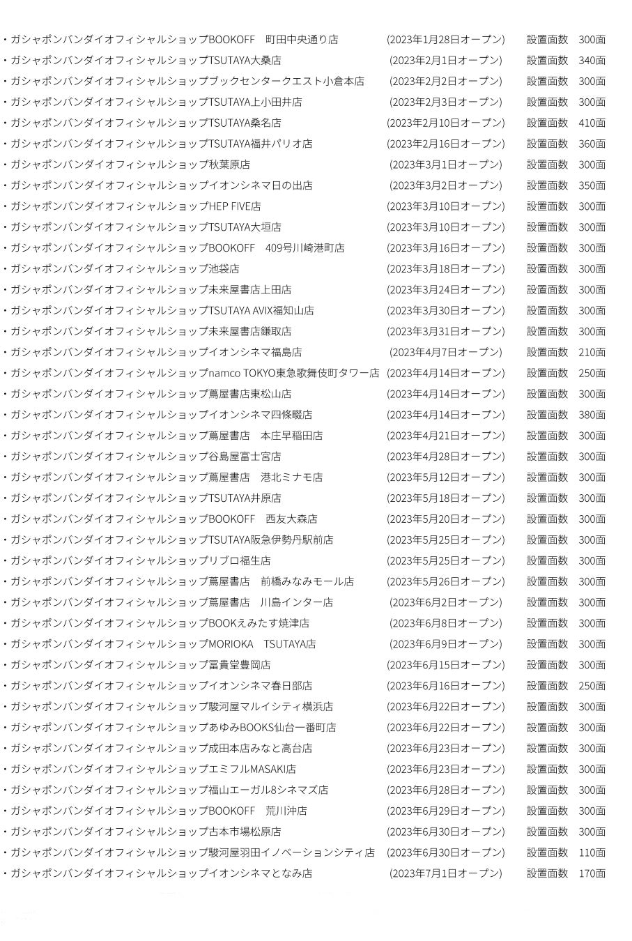 バンダイナムコアミューズメントは、2023年8月31日に佐賀県唐津市のTSUTAYA唐津店内に「ガシャポンバンダイオフィシャルショップ」をオープンします。