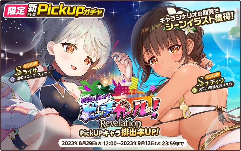 また、限定新キャラPickUPガチャではSナディラ【海辺の視線を独り占め】とSライサ【渚のスコップ・スイマー】が登場し、キャラシナリオを閲覧するとホーム画面に設定できるシーンイラストが手に入ります。