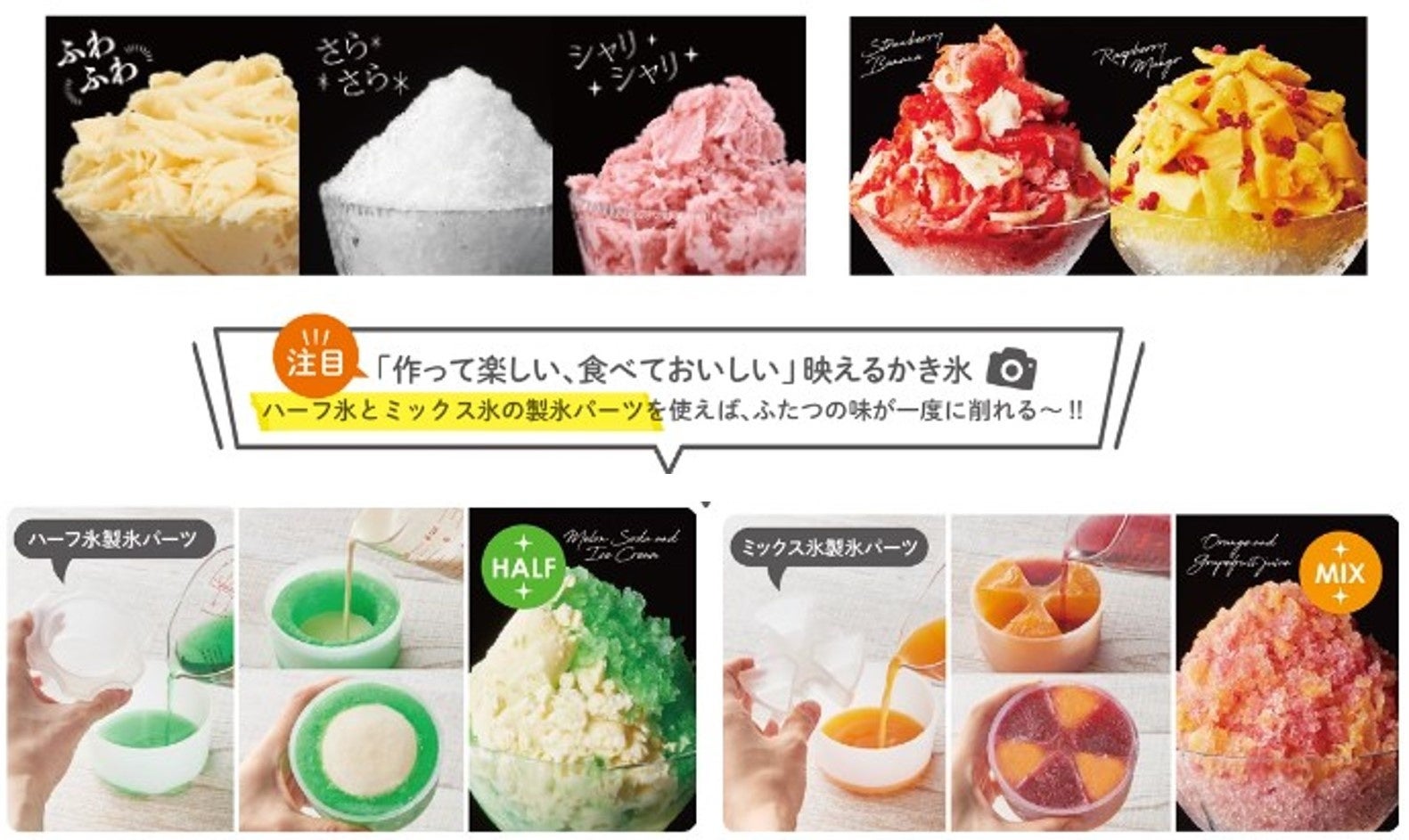 専用製氷カップが付属するのに加えて、バラ氷、牛乳やジュースなどを凍らせた味付き氷、市販の冷凍フルーツにも対応しています。付属の製氷パーツを使えば、2つの味を一度に削ってハーフ氷やミックス氷が作れます。味も見た目も楽しめる「萌える」「映える」かき氷がおうちで手軽に楽しめます。味わいや材料を色々組み合わせて作れるかき氷は無限大!自分好みのオリジナルかき氷が楽しめます。